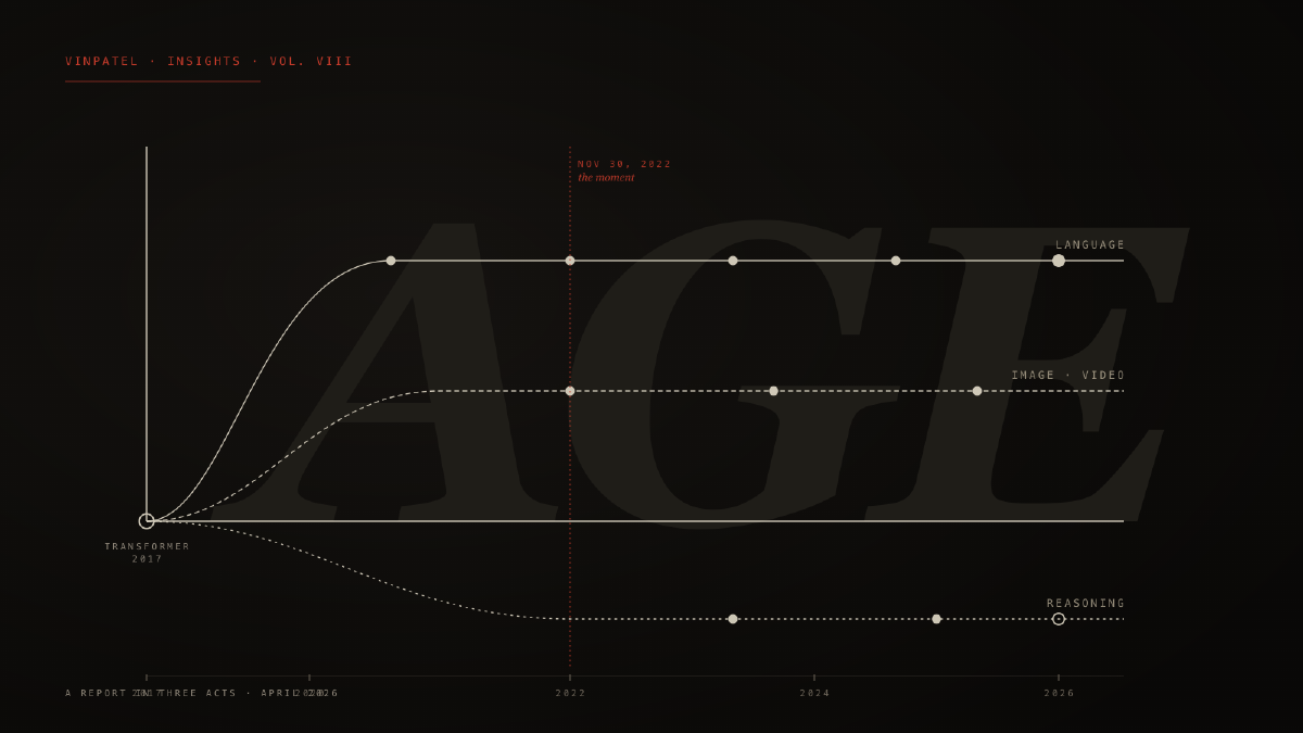 What follows is a three-act report. Act I traces the origin: the architectural and economic preconditions that made the past three years possible, and the inflections that defined them. Act II takes inventory of where we are in April 2026 — what the frontier looks like, what the productivity numbers actually say, and what the labor market has, and has not, done. Act III sketches the decade ahead: not as prediction but as fork. The Age of AI is not one trajectory. It is several, and the variables that determine which one we land in are still inside the room.