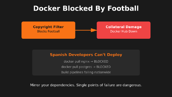 Cloudflare’s copyright blocking system accidentally broke Docker Hub access in Spain, exposing how content filters can cripple developer infrastructure.